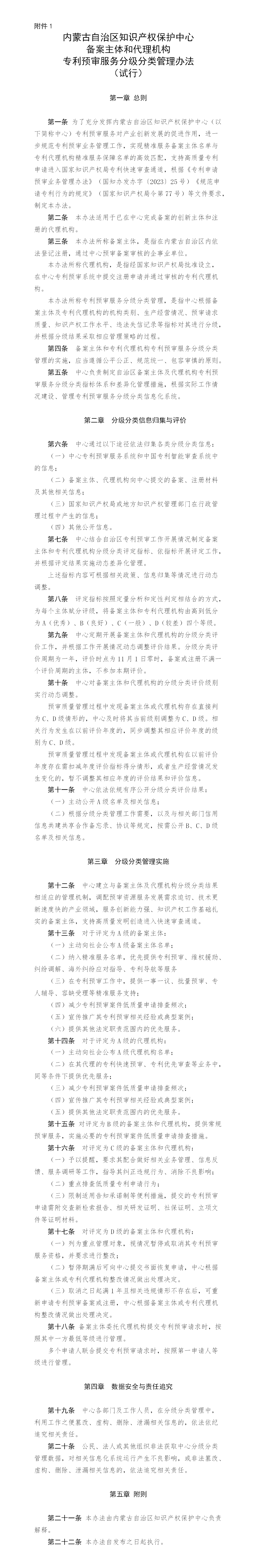 附件:1.内蒙古自治区知识产权保护中心备案主体和代理机构专利预审服务分级分类管理办法(试行)